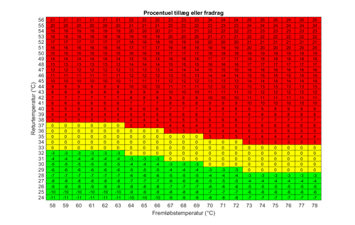 - Du får hverken tillæg eller fradrag, når din retur-temperatur ligger inden for normalområdet som er farvet gult.